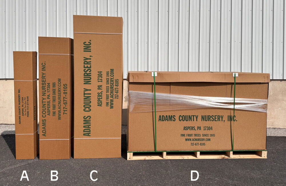 We offer pool truck services into major fruit growing regions, which is an option that can save our growers a significant amount in freight costs. Larger, direct shipments are sent out for bid using an LTL rater. When choosing carriers we take into account both the cost and number of days in transit. The driver will contact the grower directly by phone to arrange the drop, and someone must be there to receive. Smaller commercial orders will be shipped UPS ground at cost. Depending on the size of the order, our trees are packaged in either one-way shipping skids or corrugated cardboard boxes as shown below.